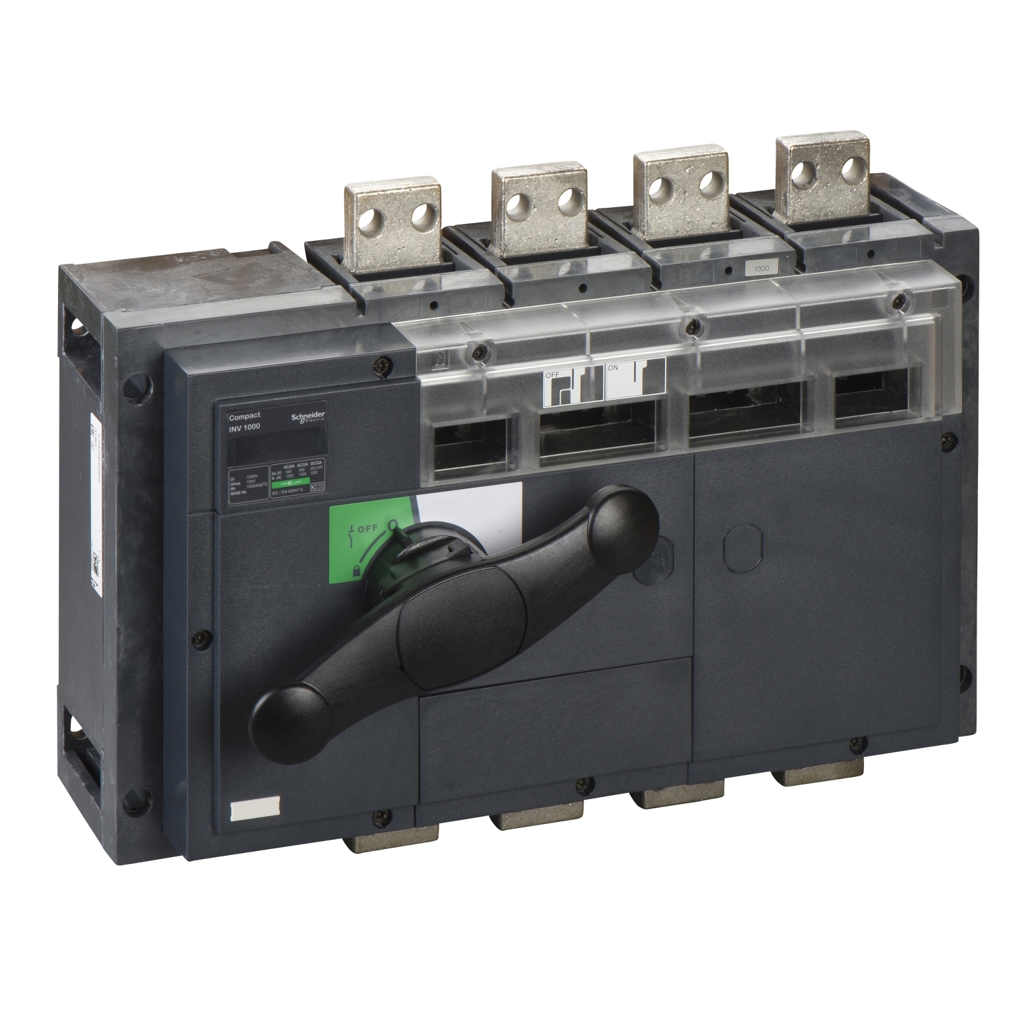 This Compact INV1000 is a 4 poles non-automatic switch-disconnector with visible break and black rotary handle. It is suitable for isolation with positive contact indication, as defined by IEC 60947-1 and IEC60947-3 standards. The operational current is 1000A at 415VAC in categories AC21A, AC22A and AC23A. The rated voltage is 690VAC 50/60Hz or 250VDC. Compact INV range allows the visible break of the main contacts through a transparent cover. The black rotary handle is designed to offer easy operation and high performance in interruption of currents. Compact INV1000 is a class II insulation level front-face device as per IEC 60664 standard.