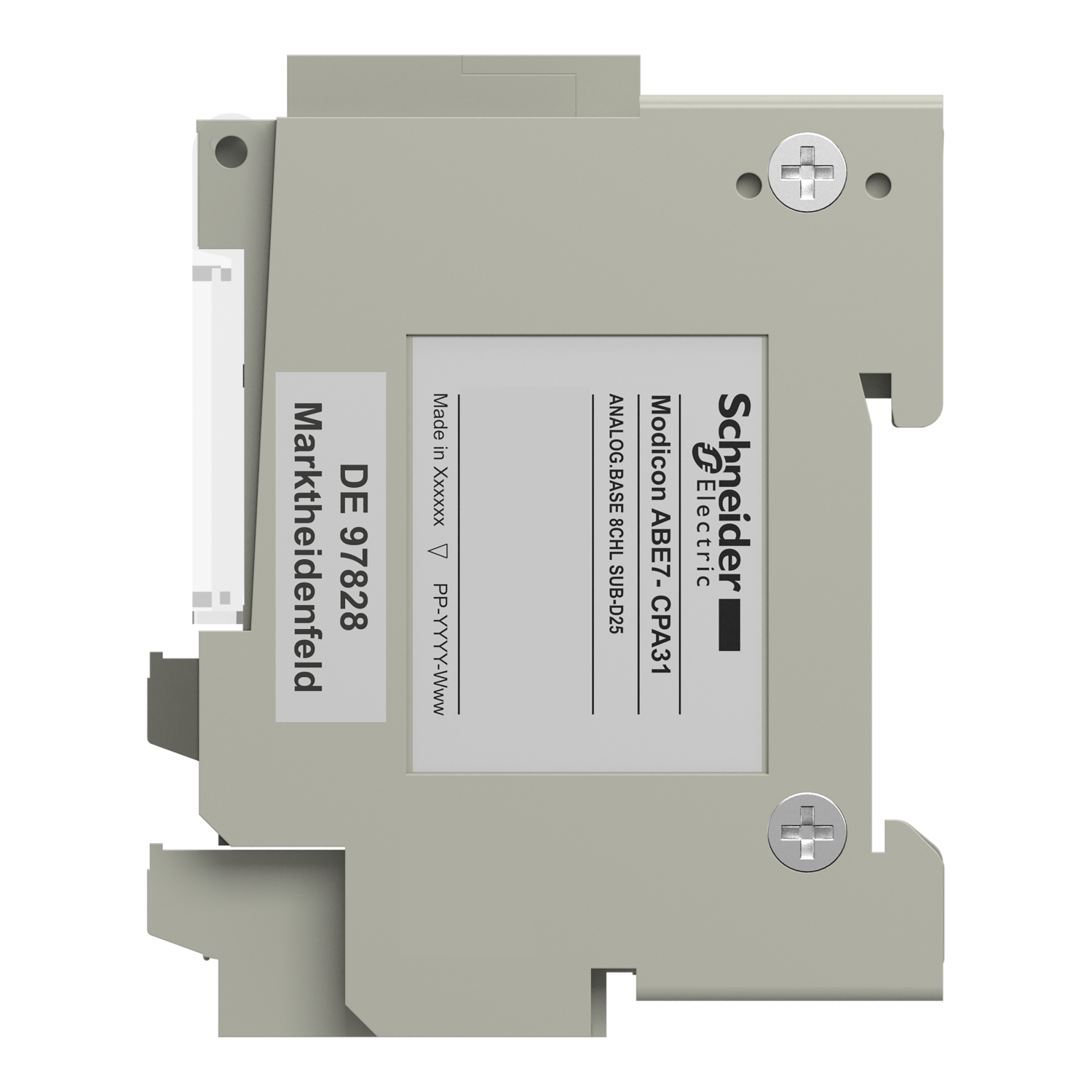 This connection sub-base is part of the Modicon ABE7 range, an offer of IP20 sub-bases for Telefast pre-wired system. It is for distribution of 8 analog input channels. It is a sub-base with a control circuit voltage of 24V DC. The distributed analog input channels are isolated from one another. It is furnished with screw type terminals for electrical connection and 25-way SUB-D connection to Programmable Logic Controllers (PLC). It is an IP20 rated product. It weighs 0.41kg. It is suitable for all types of industrial applications. This product is certified by LROS, DNV, UL, GL, BV and CSA. It meets CSA C22.2, IEC 61131 and UL 508 standards. This connection sub-base is suitable for use with Modicon X80 IO modules such as BMXAMI0800, BMXAMI0810 and BMEAHI0812. It is delivered in 1 package (PCE type). It can be fixed by clips (35mm symmetrical DIN rail) and screws (solid plate with fixing kit). Modicon ABE7 means greater simplicity to rationalise wiring in automation system equipment. Pre-wired system enabling connection and adaptation of control signals of PLC cards equipped with HE10 connectors.