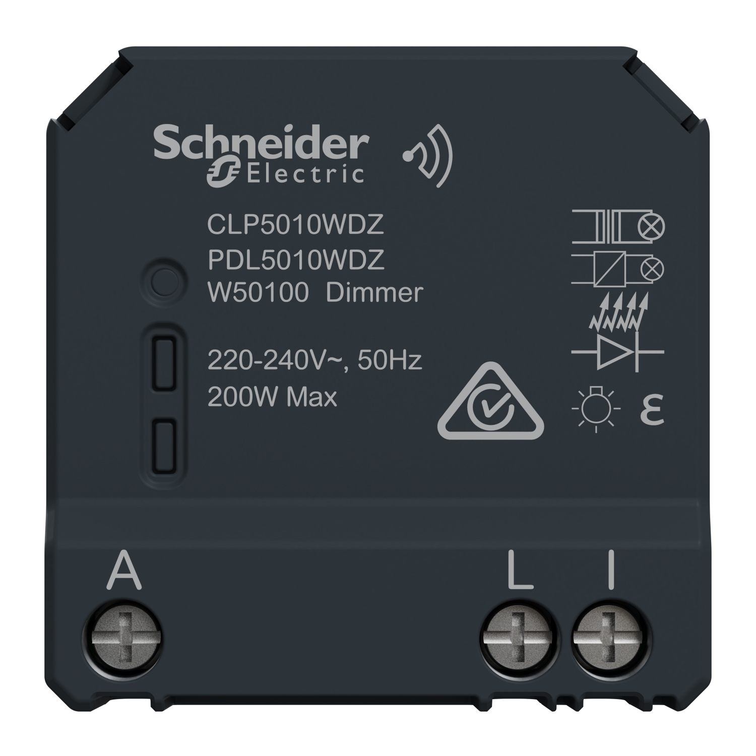 | Load type | LV halogen lamps: 0...200 W (electronic transformer), halogen lamp: 0...200 W at 240 V, incandescent lamp: 0...200 W at 240 V, compact fluorescent lamp: 0...200 W, dimmable LED: 0...150 W |