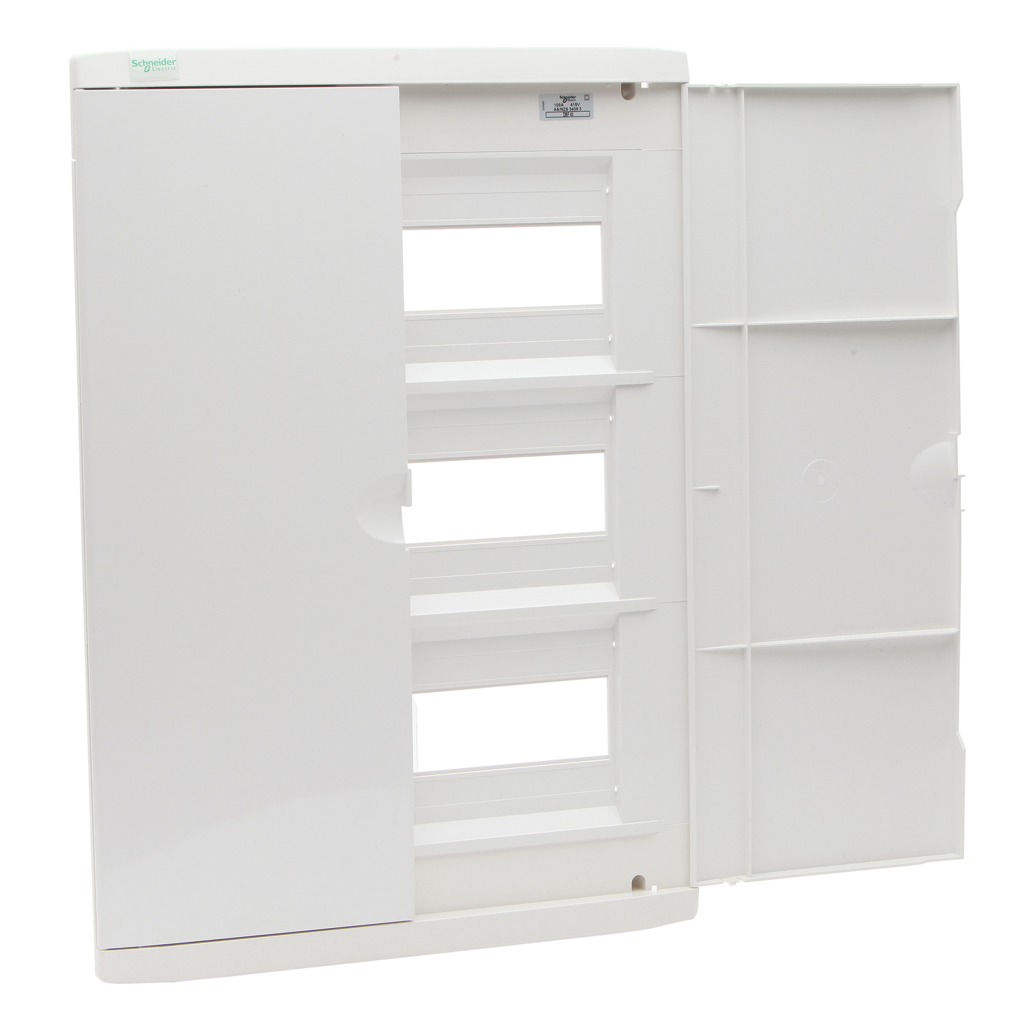 This Superboards Series product is a flush-mounted distribution bard, up to 100A. It is made of plastic. Its color is light grey with a glossy surface finish. The Ue rated operational voltage is 415V. The dimensions are (W) 376mm x (H) 666mm x (D) 100mm. It is dedicated to manage 45 ways.