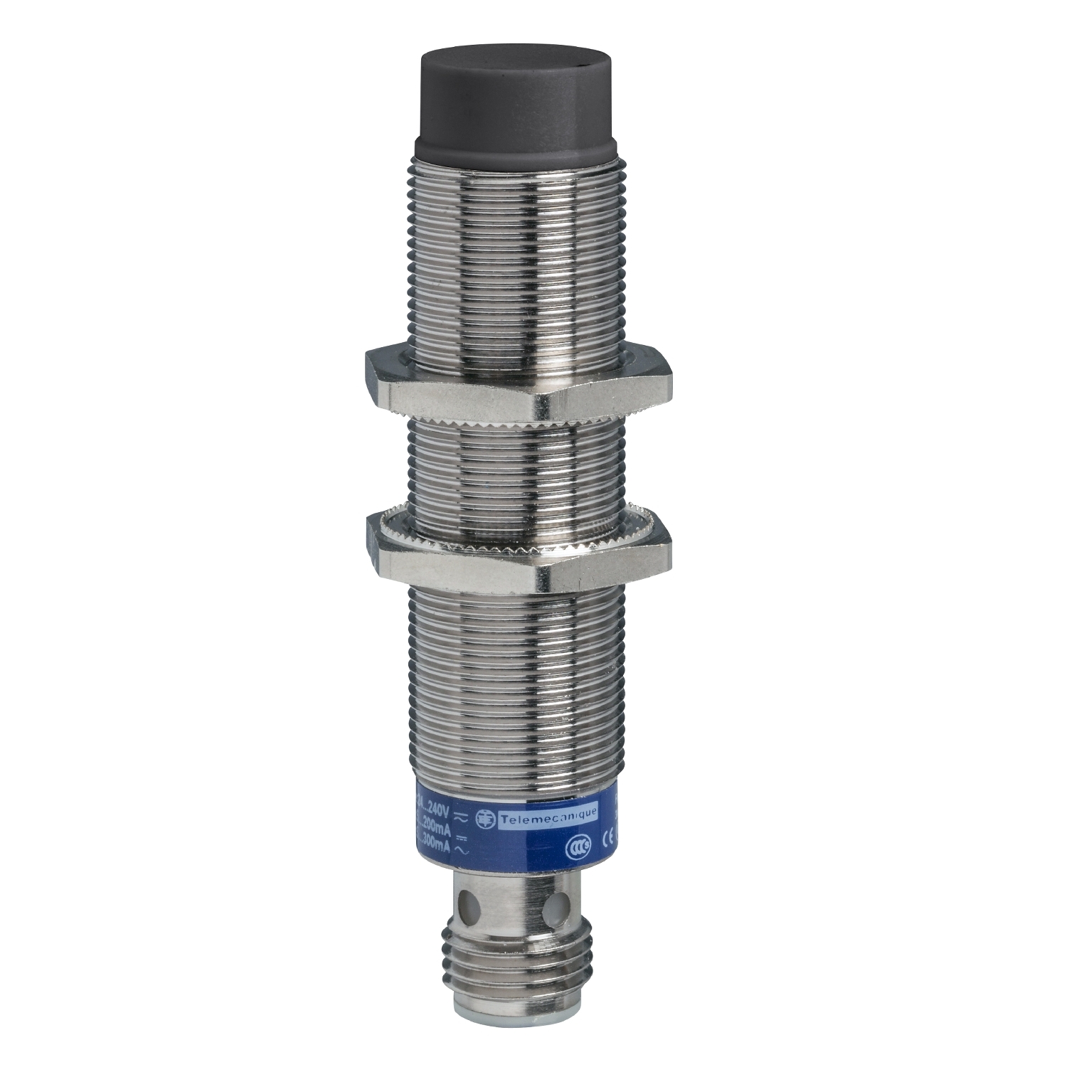 The XS range is an offer of inductive proximity sensors for the detection, without physical contact, of metal objects. The advantages of inductive detection are numerous, no physical contact with the object to be detected. Thus avoiding wear and enabling detection of fragile or freshly painted objects. High operating rates. Fast response. Excellent resistance to industrial environments (robust products, fully encapsulated in resin). This product is a cylindrical, long case, non flush mountable sensor. Diameter 18mm, threaded M18 x 1. It features a nickel plated brass case and a M12 connector. It has a sensing distance of 12mm. Three-wire, DC supply, 12V to 48V, NO function, NPN discrete output.