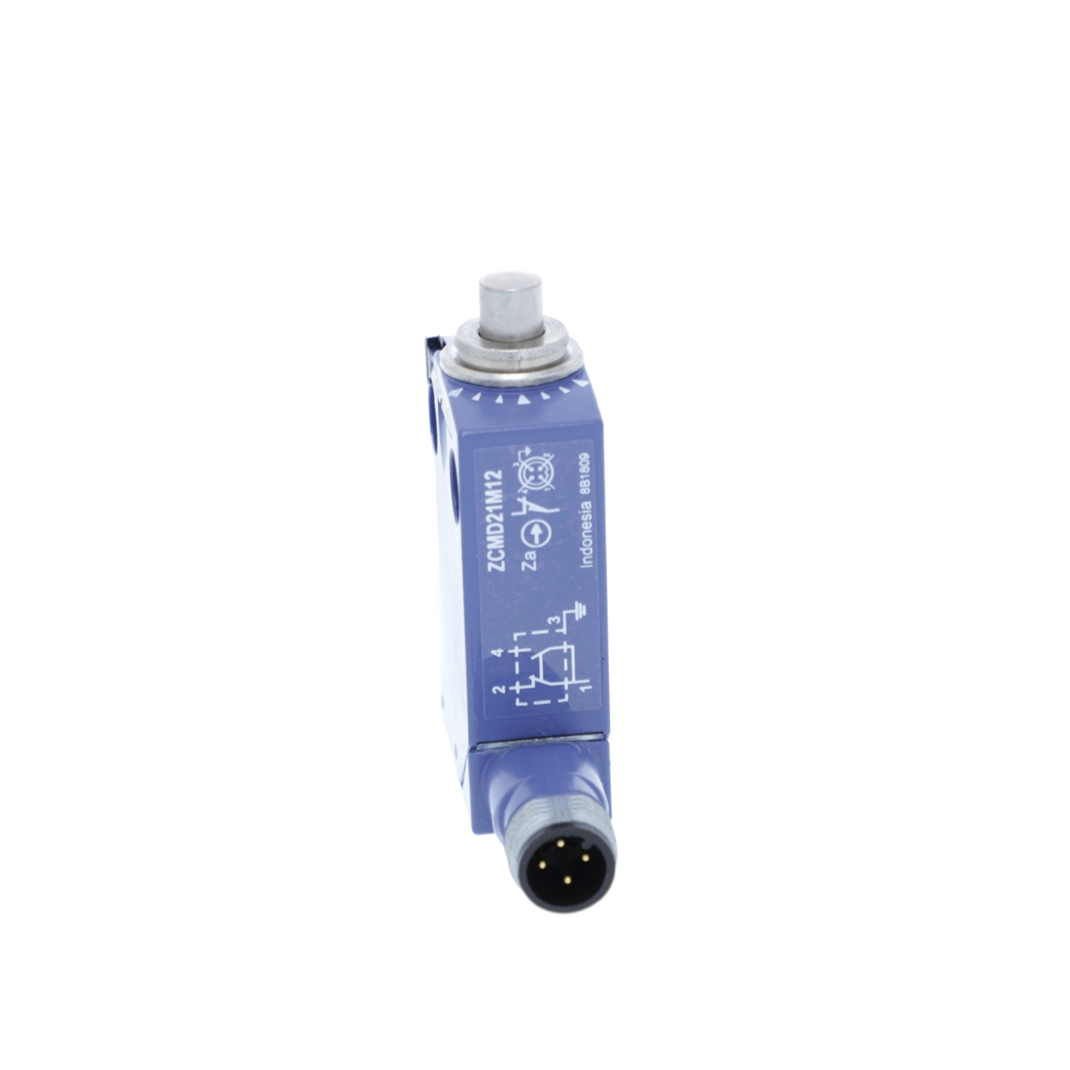 This XCMD miniature format limit switch has a metal end plunger and a Zamak body. This limit switch has a robust Zamak miniature and modular body, is pre-cabled, allowing an easier installation. It is IP66 and IK06 impact resistant, making it ideal for heavy duty use in harsh conditions. It is fixed on the machine by its body, and has a typical 5 million cycles electrical durability in DC-13 utilization category. It complies with CCC, EN/IEC 60947.-5-1, CSA C22.2 No.14, EN/IEC 60204-1, UL 508 standards. Compatible with the well distributed range of common XCK heads, allowing quick replacement in case of damage. Variable composition design allows late modifications on the switch, for example change of connection type or head. It has a standard M12 connector, compatible with all existing market sensor cabling.