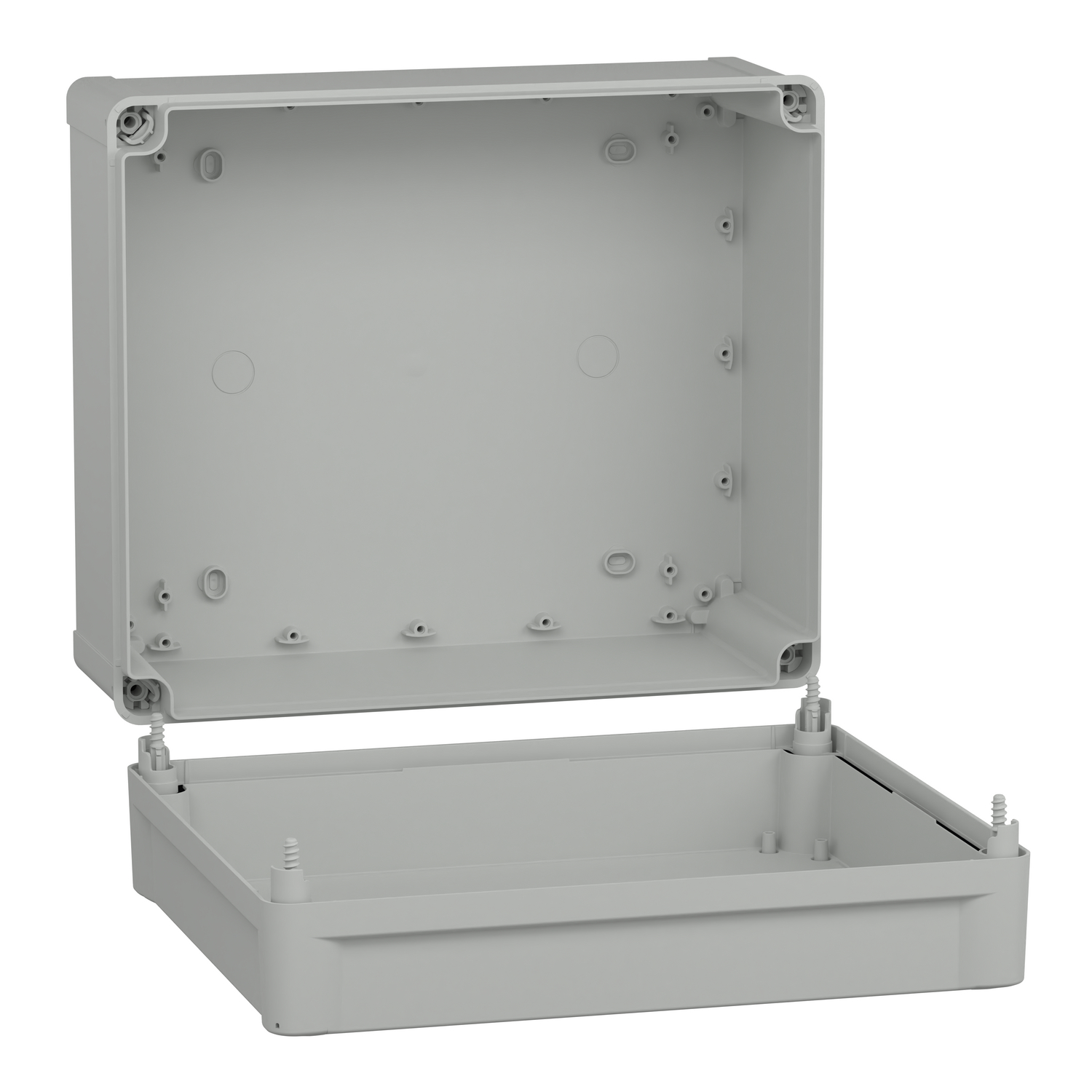Thalassa TBS industrial ABS box with opaque cover H60. Int is 325 x 275 x 160 mm. Ext is 341 x 291 x 168 mm. Wall mounted enclosure. High plain cover. Outside sealed is flat screwdriver captive screw lock. Certifications is DEMKO, SEMKO, TÜV. Fire resistance 650°. ABS (acrylonitrile butadiene-styrene). IP66 (NEMA 4.4X), IK07, Grey RAL 7035, Insulation Class II. Set of 2. Ambient temperature for storage/operation is (-15 to 40°C)/(-25 to 60°C).