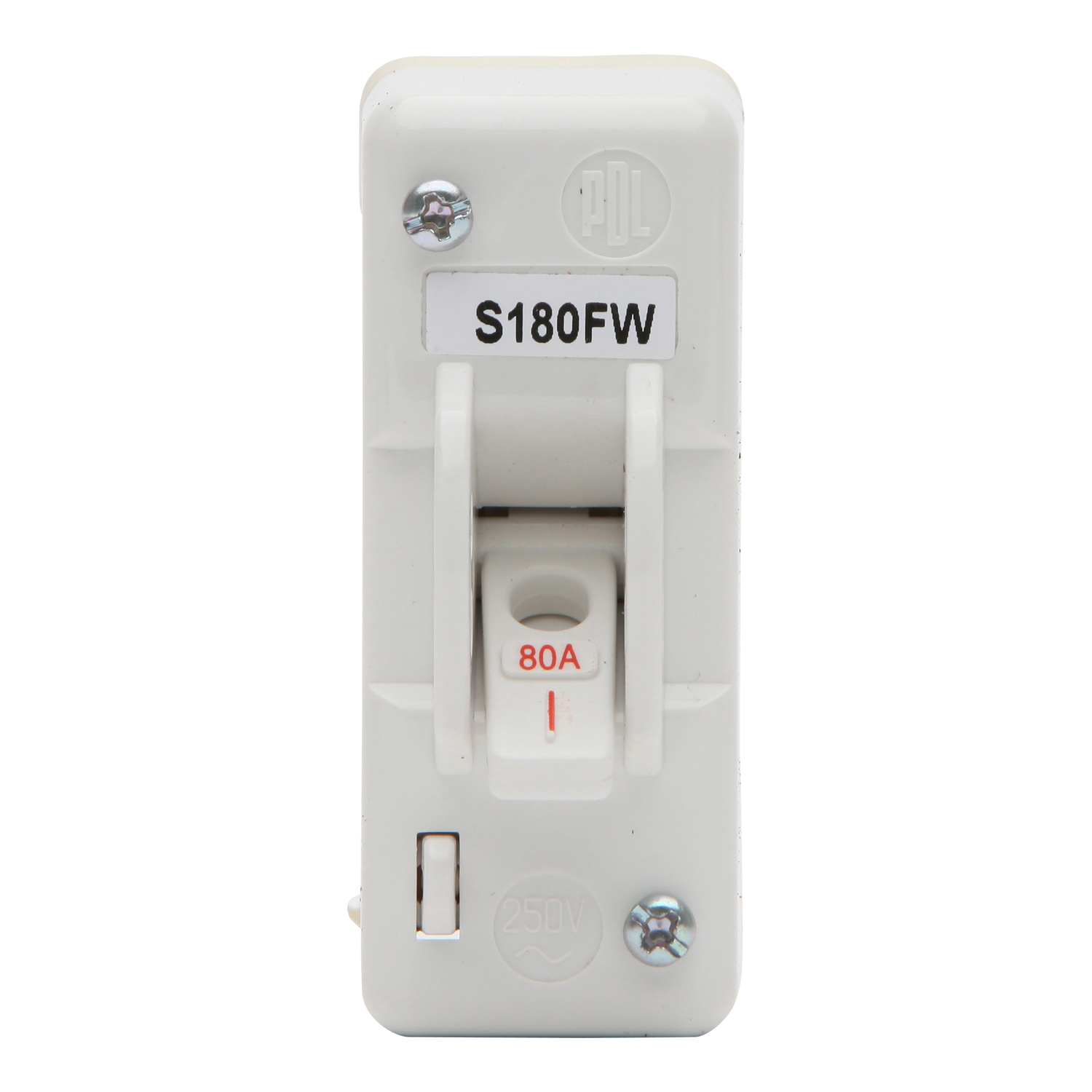 Upgrade your electrical setup with the PDL S Series Front Wiring Mains Switch, engineered for high-performance in both residential and commercial environments. Complies with AS3133 M200 standards for motor control. The rated current is 80A and the rated operational voltage is 250VAC. The device comes with a screw terminal that offers a more secure connection for larger wires, reducing the risk of loose wires caused by external factors. Surface-mounted design with flexible cable entry options and generous wiring space. The dimensions are (W) 28.4mm x (H) 70mm x (D) 51mm. The product is white and has a glossy surface finish. It is made of PC (polycarbonate), which is resistant to wear and tear.