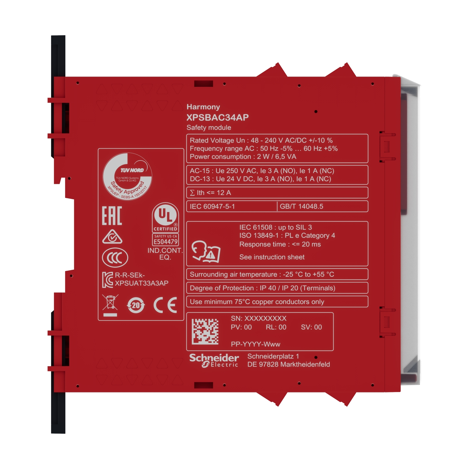 This safety relay is designed for monitoring Emergency stop and Guard switch. The safety relay is powered with 48-240V AC/DC, and equipped with a screw removable terminal block. This basic safety modules embeds pre-defined safety functions. This safety relay embeds 1 control output, 4 NO safety outputs, and 2 NC diagnostic outputs. The maximum safety level achieved by this safety relay is PLe/Category 4 conforming to ISO 13849-1, SILCL 3 conforming to IEC 62061, SIL 3 conforming to IEC 61508. This safety relay weighs 0,200kg. Its dimensions are 22,5mm (Width) x 120mm (Depth) x 100mm (Height). This safety relays is suitable for applications such as Food and Beverage, Hoisting, Material Handling, Material Working, Packaging. This safe relay conforms to IEC 60947-5-1, IEC 61508-1, IEC 61508-2/-3, ISO 13849-1, IEC 62061 functional safety standards, is certified by cULus, TÜV. Harmony safety relays are compatible with Modicon logic controllers. This relay is mounted on a 35mm symmetrical DIN rail. Harmony XPS Basic and Universal safety relays are the first choice for managing single safety functions easily, typically in machines of simple to medium complexity. Harmony XPS Basic offers the most optimised solution for applications with hardwired safety modules.