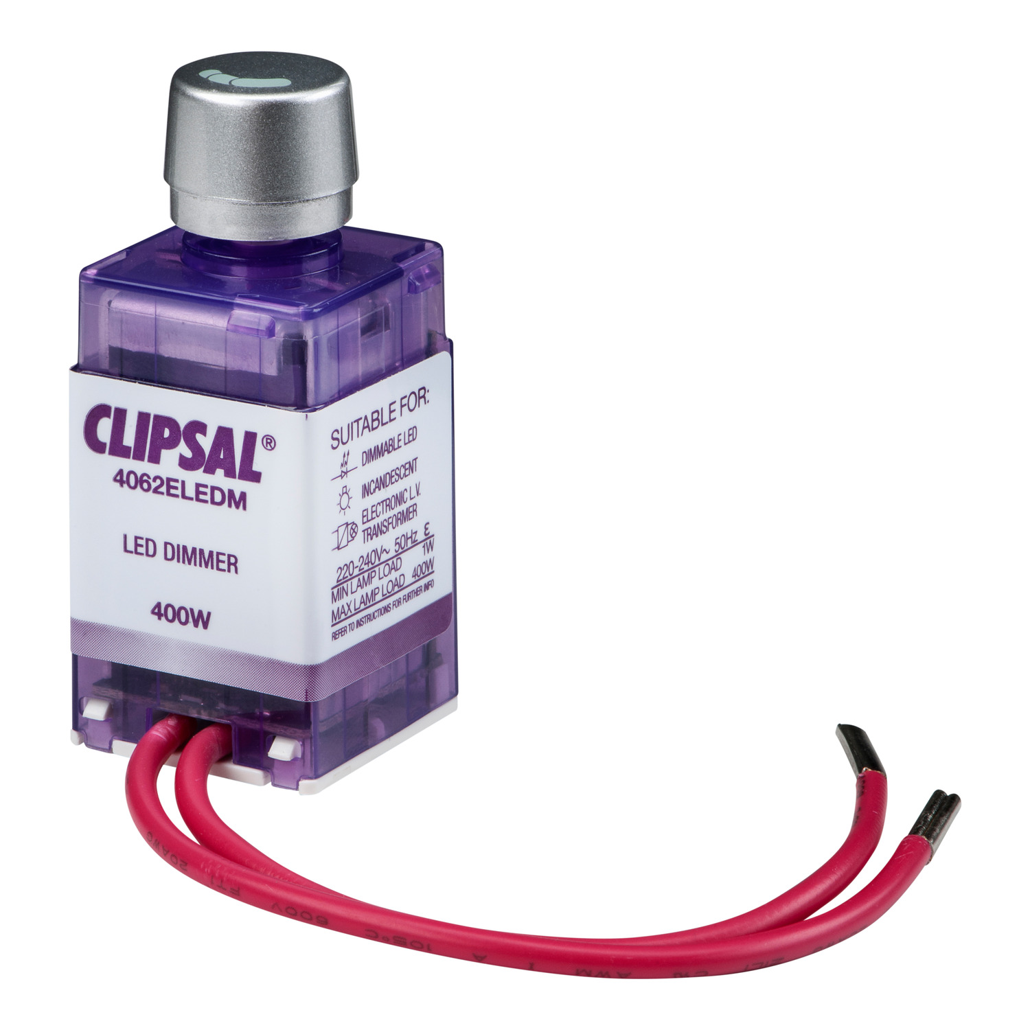 Dimmer module with rotary knob. Requires separate switch.. 60 Series module. Suitable for Clipsal Saturn. Colour: Translucent For 400W dimmable LED. Operating voltage 240V a.c. 50Hz Note: Requires installation by an appropriately licenced electrician.