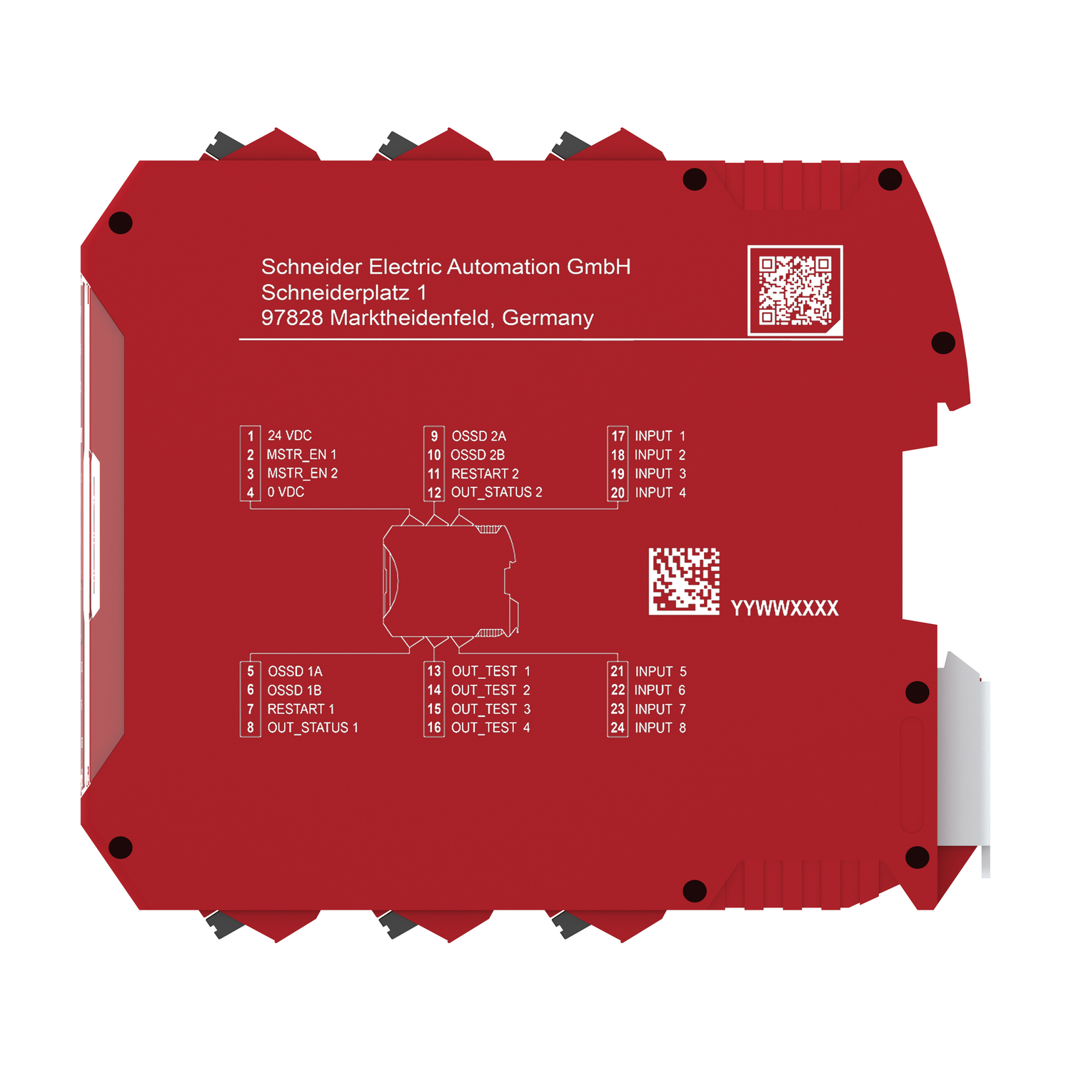 | Local signalling | 2 LEDs yellow with STATUS marking for output channel, 2 LEDs yellow with RST marking for restart signal, 2 LEDs green/red with OUT marking for output status, 8 LEDs yellow with IN marking for input status, 1 LED blue with EN marking for master enable, 1 LED orange with COM marking for communication, 1 LED red with E EX marking for external error, 1 LED red with E IN marking for internal error, 1 LED green with RUN marking for RUN (status), 1 LED green with PWR marking for power ON |