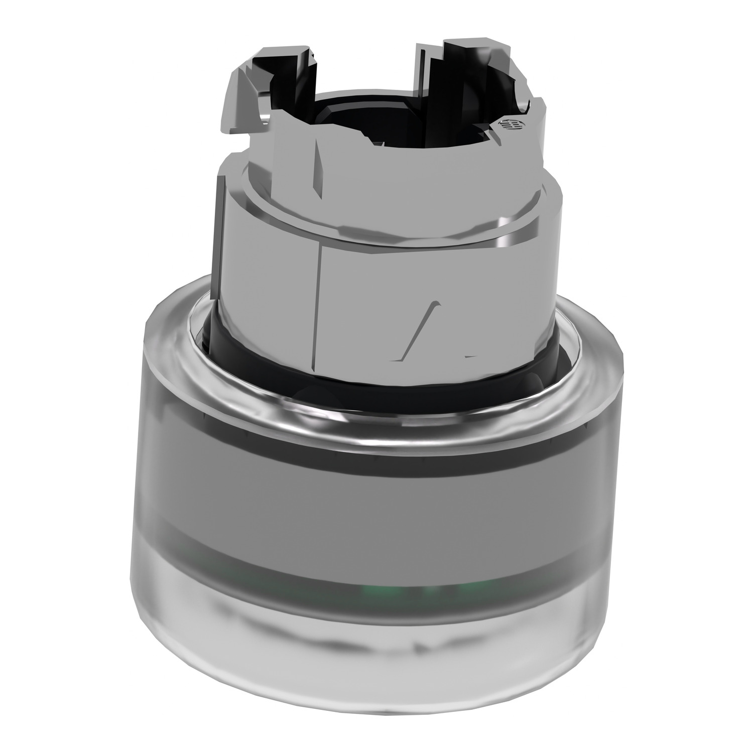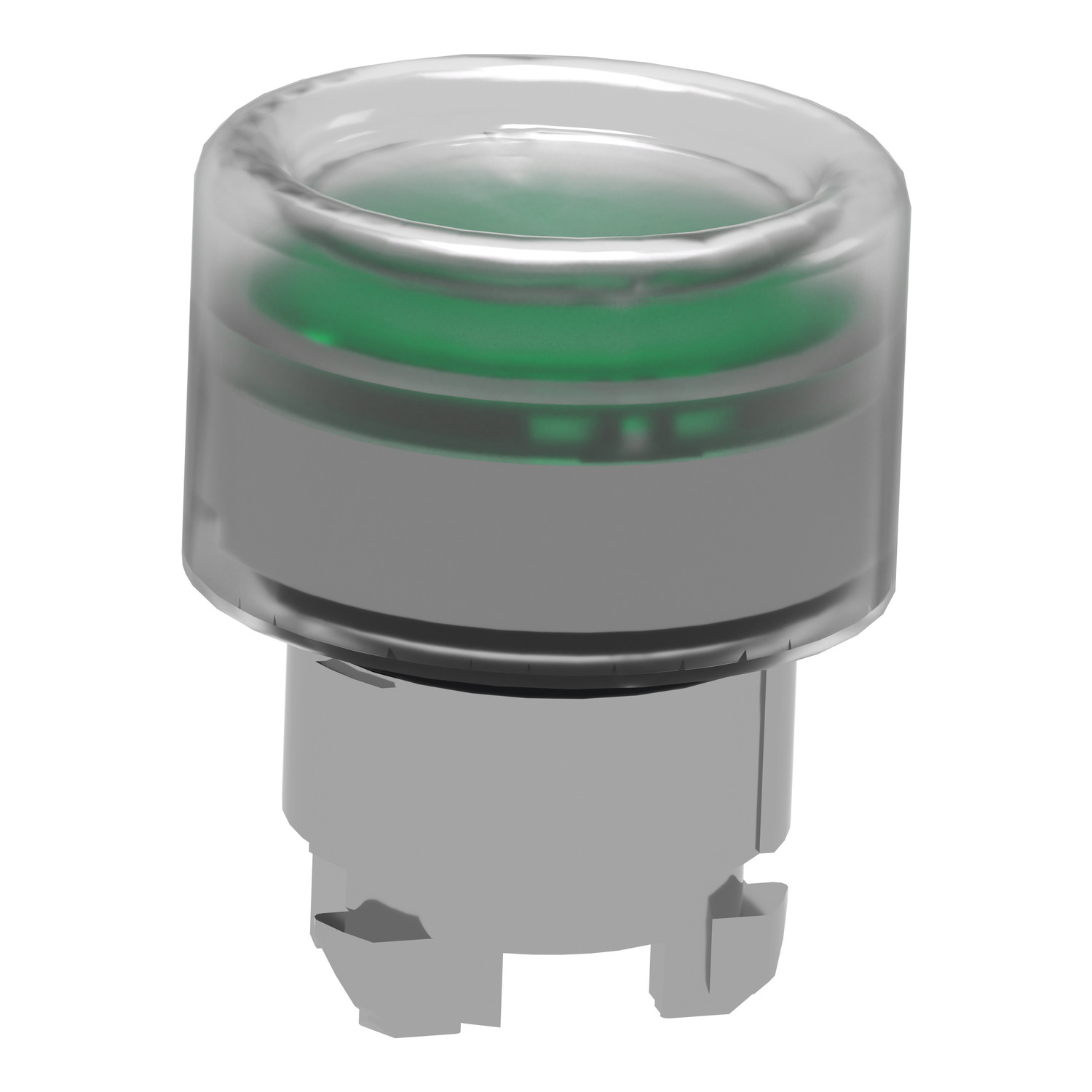 Head for illuminated push button, Harmony XB4, metal, green flush, 22mm, universal LED, spring return, clear boot
