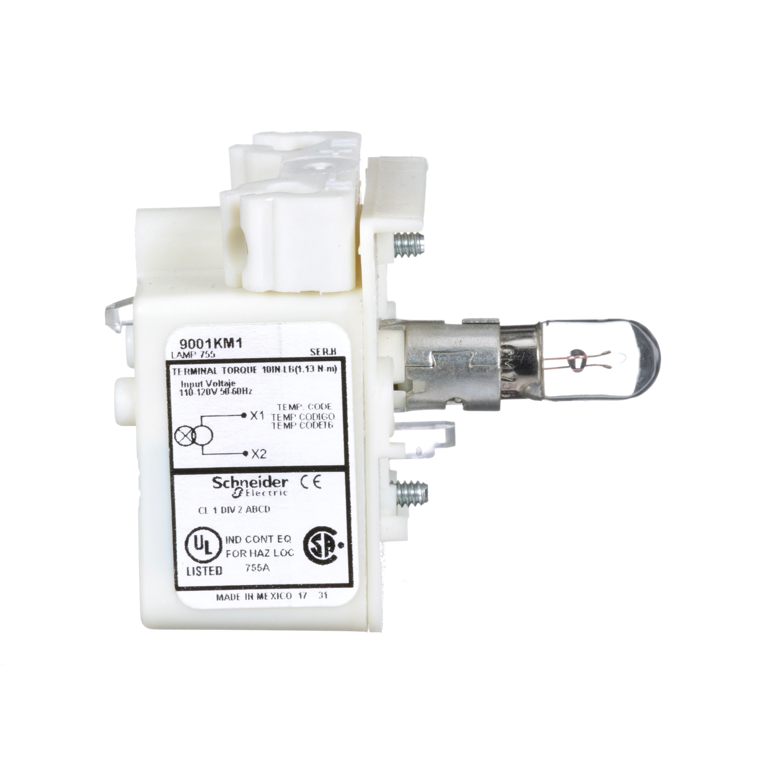 This light blocks is a separate component of the range of control and signaling units, Harmony 9001K / 9001SK diameter 30mm. It is supplied with 120V AC via integral transformer and includes a BA 9s 6 V bulb incandescent. It is compatible with pilot lights and illuminated pushbuttons of Harmony 9001K and Harmony 9001SK ranges. It weighs 144g. The 30 mm Harmony range offers a large choice of robust and reliable products to meet a great number of applications in heavy industries such as petrochemy, metallurgy, mining oil and gas wastewater treatment, automobile manufacturing. It is UL listed and CSA certified, CE declaration of conformity and RoHS compliant.