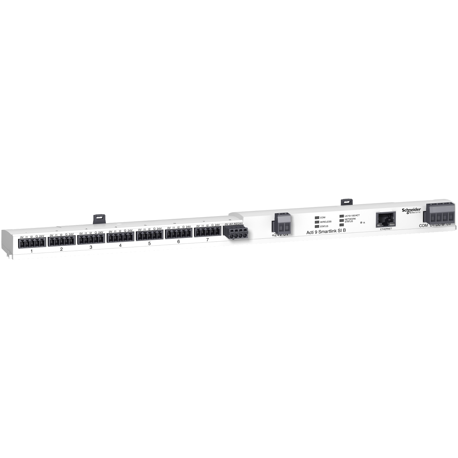 This Acti 9 Smartlink SI B is a Modbus Master TCP/IP and Wireless smart communication module with 7 channels and 1 analog input. It communicates with the auxiliaries iACT24 for iCT contactors, iATL24 for iTL impulse relays, iOF+SD24 for iC60, iID, ARA, RCA & iSW-NA. It can master up to 8 Acti 9 SmartLink ModBus or other ModBus slaves connected thanks to the RS485 Modbus connector. It is used to transfer data from Acti 9 devices to a PLC or network monitoring system thanks to the RJ45 Ethernet connector. It communicates also with OF+SD24 for C60, C120, DPN, ID & C60H-DC, Ti24 for RCA iC60 & Reflex iC60. It can associated upto 20 PowerTag energy sensors with radiofrequency communication. It is supplied with1 power supply connector 24VDC, 2 bolts for mounting on Linergy FM80. The link is Ethernet 10/100MB. The transfer rate is self-adaptable from 9600 to 19200 baud. The Modbus addresing range is 1 to 247. It is a 4-pin connector type of bus. The It is a plug-in connection. The maximum length of the bus is 1000m. The maximum cable length is 30m. The voltage power supply is 24VDC +/- 10%. The Maximum input current is 1,5A. The Maximum inrush current is 3A. The degree of protection is IP20. The pollution degree is 3. It complies with RoHS directive. The duration of saving memory is 10 years. The dimensions are (W) 359mm x (H) 23mm x (D) 42mm. The weigth is 180g. The operating temperature is -25°C to + 60°C and only +50°C if vertical mouting. The storage temperature is -40°C to + 80°C. This product complies with IEC/EN 61131-2 standard.
