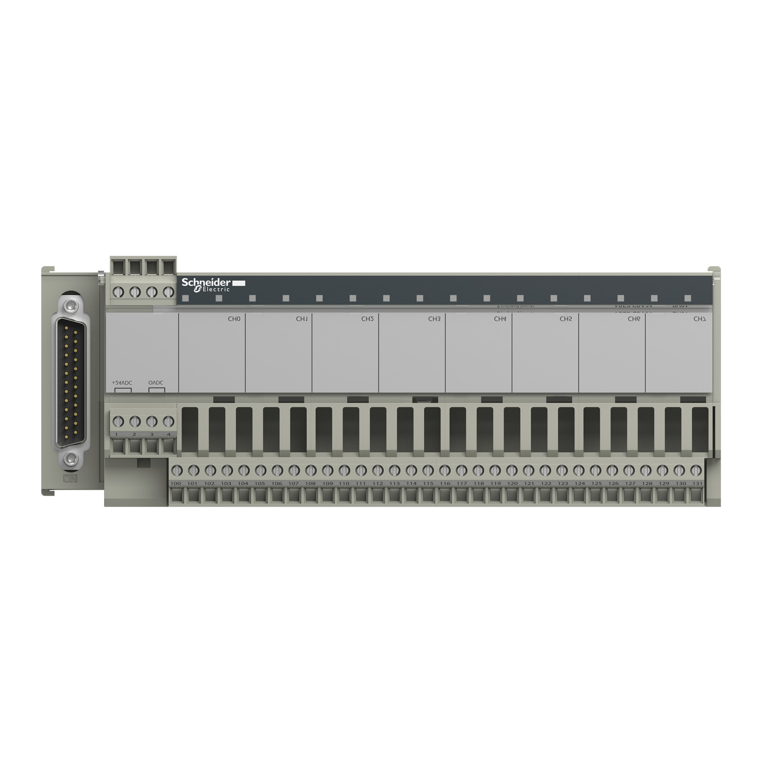 This connection sub-base is part of the Modicon ABE7 range, an offer of IP20 sub-bases for Telefast pre-wired system. It is for distribution of 8 analog input channels. It is a sub-base with a control circuit voltage of 24V DC. The distributed analog input channels are isolated from one another. It is furnished with screw type terminals for electrical connection and 25-way SUB-D connection to Programmable Logic Controllers (PLC). It is an IP20 rated product. It weighs 0.41kg. It is suitable for all types of industrial applications. This product is certified by LROS, DNV, UL, GL, BV and CSA. It meets CSA C22.2, IEC 61131 and UL 508 standards. This connection sub-base is suitable for use with Modicon X80 IO modules such as BMXAMI0800, BMXAMI0810 and BMEAHI0812. It is delivered in 1 package (PCE type). It can be fixed by clips (35mm symmetrical DIN rail) and screws (solid plate with fixing kit). Modicon ABE7 means greater simplicity to rationalise wiring in automation system equipment. Pre-wired system enabling connection and adaptation of control signals of PLC cards equipped with HE10 connectors.
