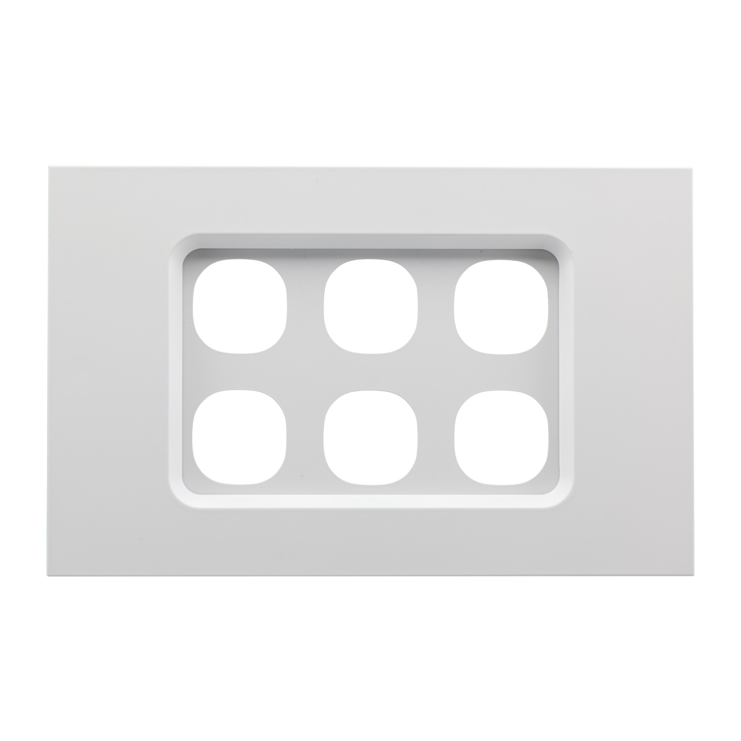 Switch grid and cover. Switch mechanisms are purchased separately. Suitable for 6-gang installations. Clipsal Saturn Zen. Colour: Zen White Note: Requires installation by an appropriately licenced electrician.