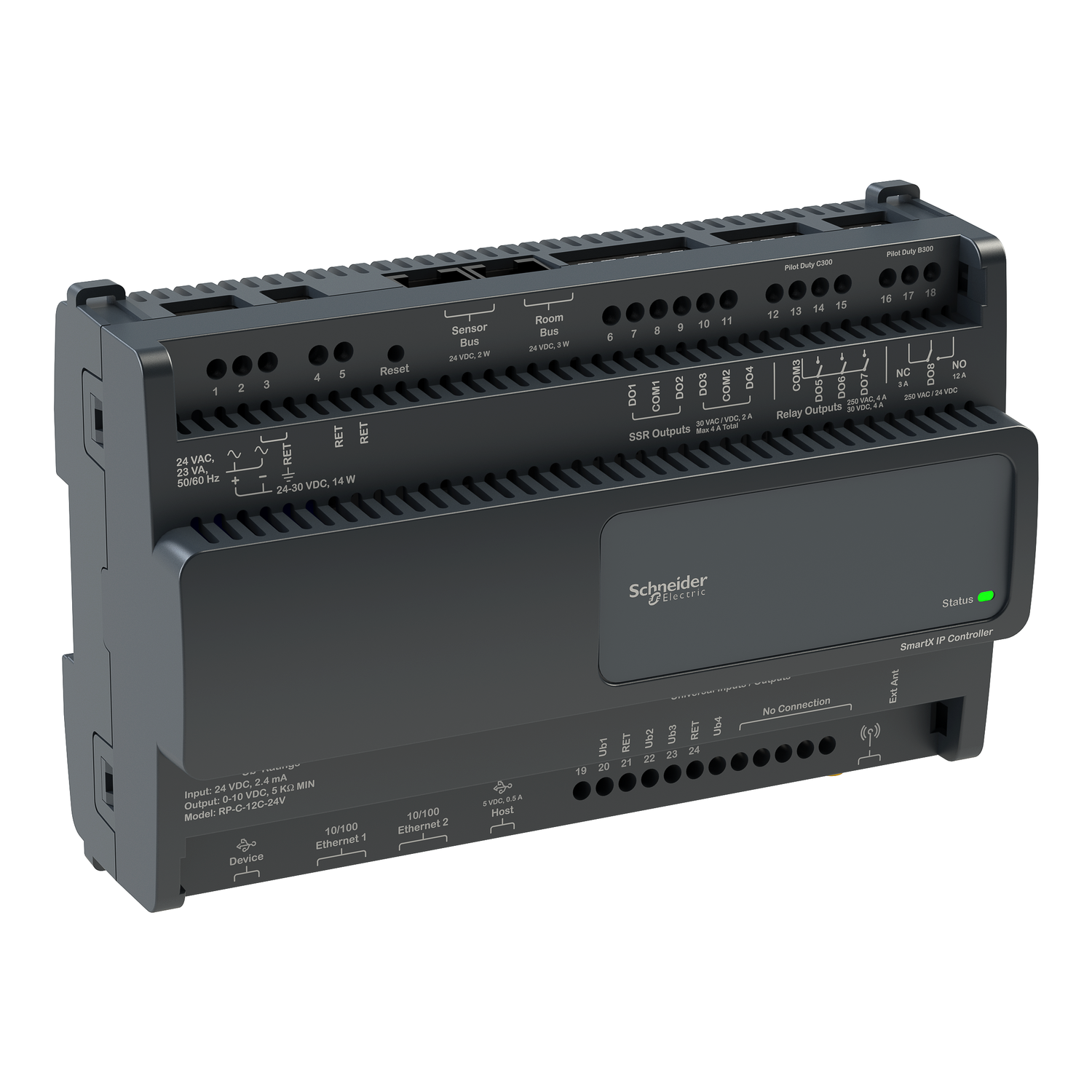 SpaceLogic RP-C Controller is a room-purpose, fully programmable, BACnet IP field controller for HVAC and Connected Room solutions applications. It can be used as a standalone BACnet/IP controller or as part of an EcoStruxure BMS with a AS-P, AS-B or an Enterprise Server as the parent server. The RP-C features a wireless chip that allows the mobile commissioning application to connect directly to the controller. The RP-C controller comes in three models with different I/O count. The RP-C-12C has 4 Universal I/O Type Ub, 4 solid-state relay outputs, 3 Form A relays and 1 high power relay outputs. Its dimensions are 164 mm (6.5 in.) in height, 181 mm (7.1 in.) in width and 64 mm (2.5 in.) in depth. It is a UL 916 (Open Class Energy Management Equipment) listed product for the United States and Canada - UL file E80146. The device can be mounted in a DIN rail or other flat surface inside a cabinet. Available optional covers (SXWRPCCOV10001), DIN-RAIL clip/end clip (SXWDINEND10001), eCommission Bluetooth Adapter (SXWBTAECXX10001).