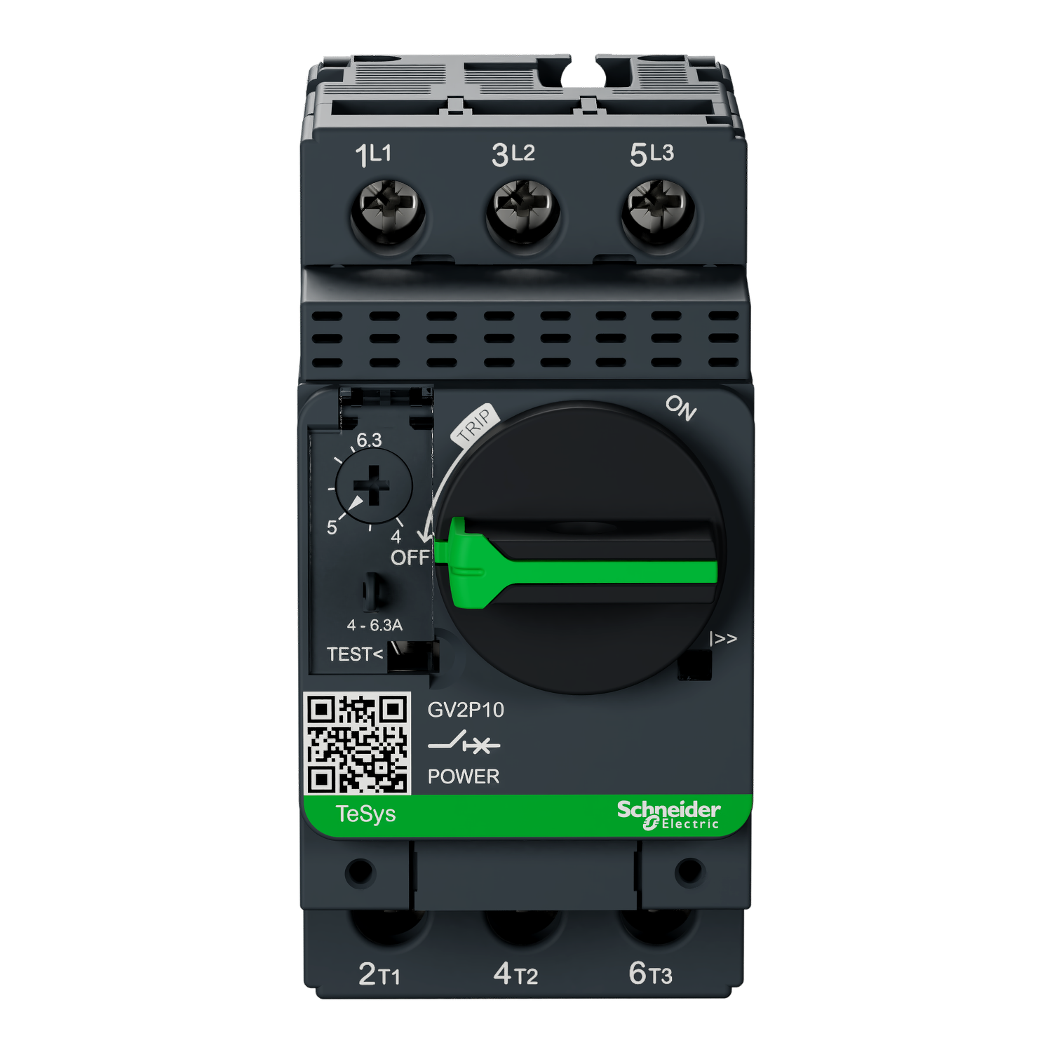 TeSys GV motor circuit breaker, 3 poles (3P), 6.3A/690V, for 3-phase motor applications 2.2kW@400V. It provides a thermal-magnetic protection with a thermal setting range 4-6.3A, magnetic tripping at 13xIn, high breaking capacity Icu 100kA@400V. Connection by screw clamp terminals. Start-stop control by rotary knob guaranteed for 100 000 cycles AC-3. Multi standards certified (IEC, UL, CSA, CCC, EAC, Marine, ATEX).