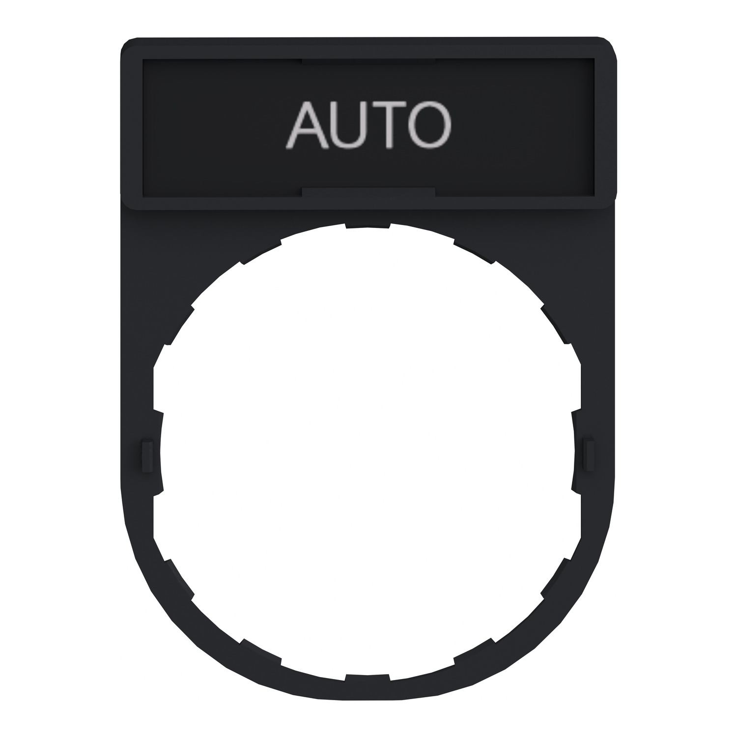This Harmony Legend holder has a black background and is marked with a "AUTO" lettering. It is compatible with Harmony XB4, XB5 and XB7 push buttons and pilot lights. This legend holder allows you to customize the control unit with an engraved tag, in line with the design approved by your customer. It is compatible with any standard 22mm Harmony control or signalling unit. It provides clear and resilient symbol marking on the label, with high contrast.