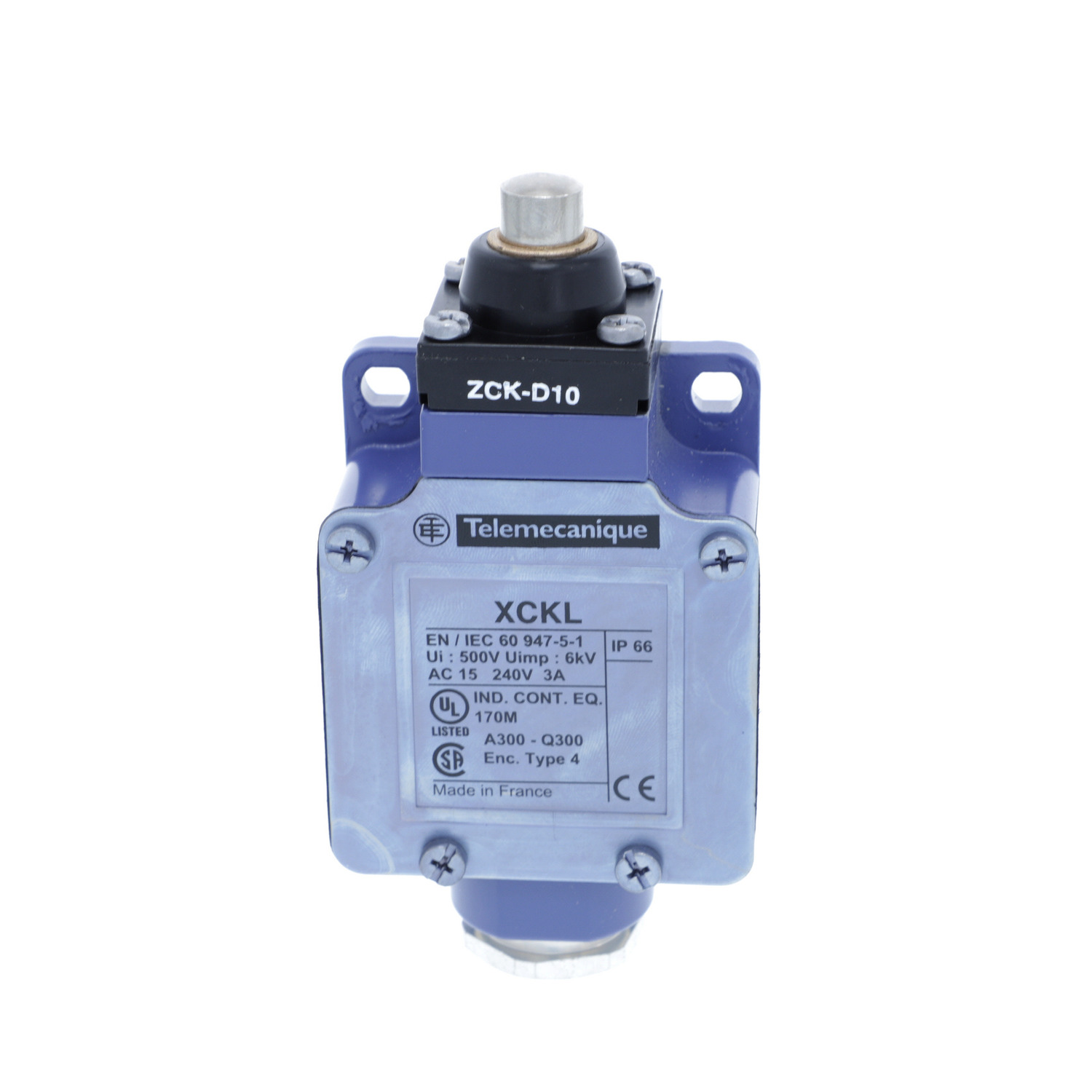 This XCKL classic format limit switch has a metal end plunger and a Zamak body. This limit switch has a robust Zamak body, a modular design allowing easier maintenance and a classic format. It is IP66 and IK05 impact resistant, making it ideal for heavy duty use in harsh conditions. It is fixed on the machine by its body, and has a typical 5 million cycles electrical durability in DC-13 utilization category. It complies with EN/IEC 60947.-5-1, CSA C22.2 No.14, EN/IEC 60204-1, UL 508, BV standards. Compatible with the well distributed range of common XCK heads, allowing quick replacement in case of damage. Variable composition design allows late modifications on the switch, for example change of connection type or head.