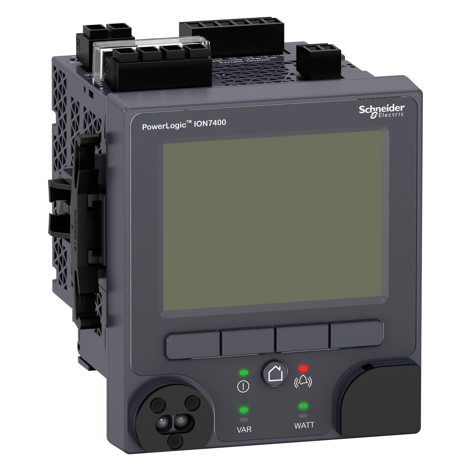 PowerLogic ION7400 utility feeder power meters combine capabilities not typically available in compact meters. They offers a hight flexibility and usability, along with accurate 3-phase energy and power measurements with data logging. Use Power Monitoring Expert software for data analysis or share operation data with SCADA systems through multiple communication channels and protocols. Certified by third party labs for energy accuracy (IEC 62052-11, IEC 62052-22, IEC 62052-24) and power quality (IEC 62586-2, IEC 61000-4-30 Class S). Cybersecurity features include secure protocols (HTTPS, SFTP), security event logging, Syslog protocol. Ability to enable/disable communication ports, and 16 user configurable accounts. With 512 MB of memory to support 50 data logs, 50+ user-definable alarms, waveform captures, 1/2 cycle RMS logging, custom web pages, min/max logs, energy trends, and Time of Use. The ability to timestamp events to +/-1 ms utilizing time synchronization method that include PTP (IEEE1588), NTP, IRIG-B, GPS ASCII (RS485) and network time set function. 3 digital inputs and one digital output. I/O option modules include 2 relays and 6 digital inputs or 2 analog outputs and 4 analog inputs. Wide control power range of 20-60 VDC. Operating environment of -25 to +70C; Humidity rating of 5% to 95%; Altitude up to 3000 m. Panel mounting (1/4 DIN) with integrated display.