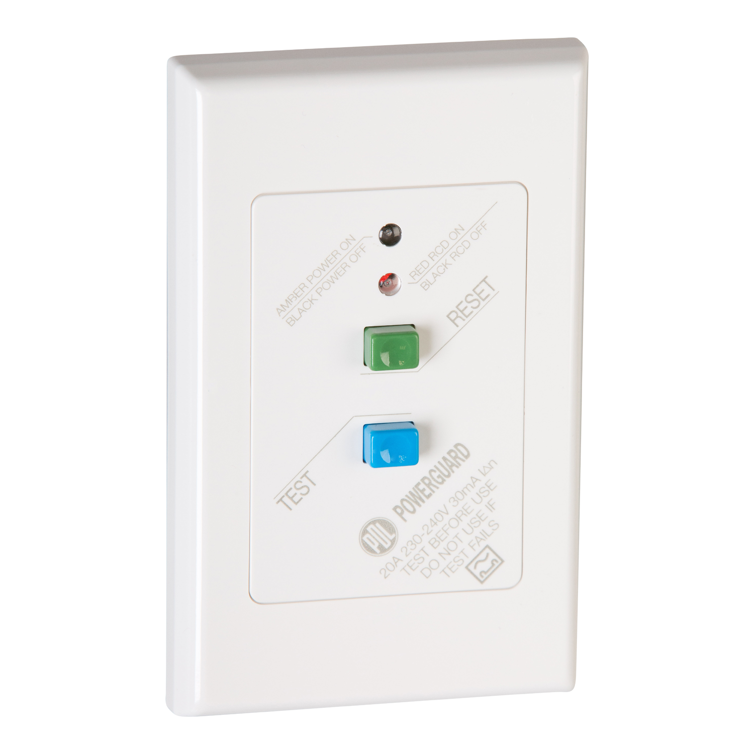RCD flush plate. 30mA trip. Colour: White Rated current: 20A. Operating voltage 240V a.c. 50Hz. Note: Requires installation by an appropriately licenced electrician.