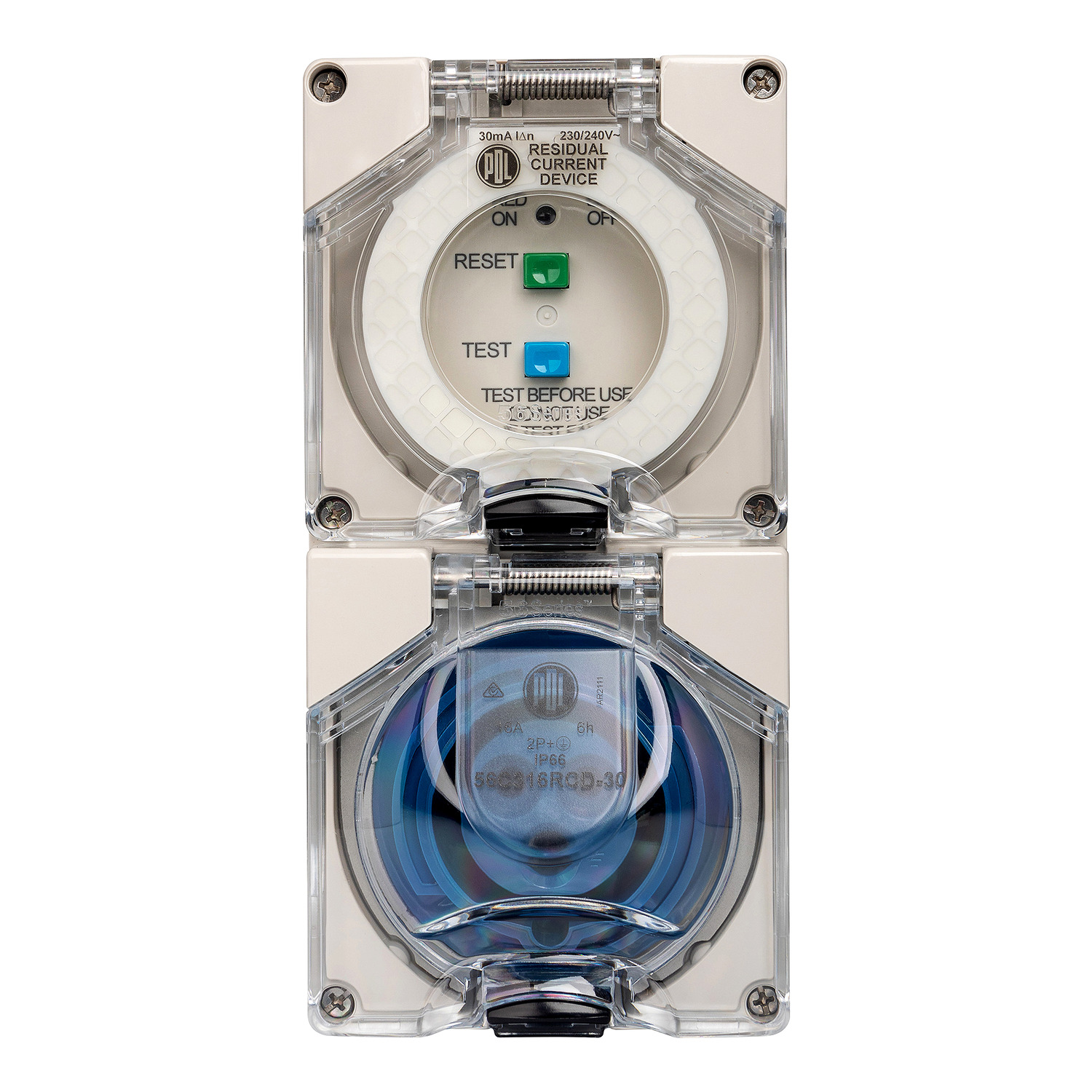 RCD Protected IEC Socket, 16A, 240V, 3-Round Pin, 2-Gang, Grey