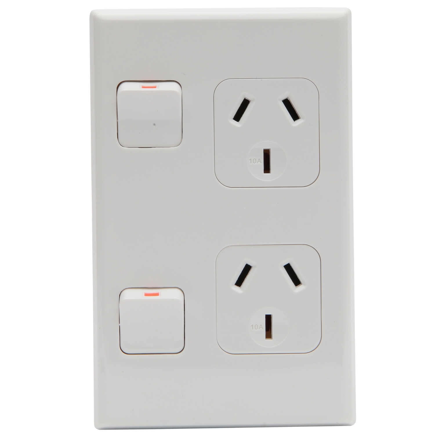 Socket outlet assembly for vertical installations. Twin switched socket. 600 Series cover and socket grid are included. PDL 600. Colour: White Rated current: 10A. Operating voltage 250V a.c. 50Hz. Note: Requires installation by an appropriately licenced electrician.