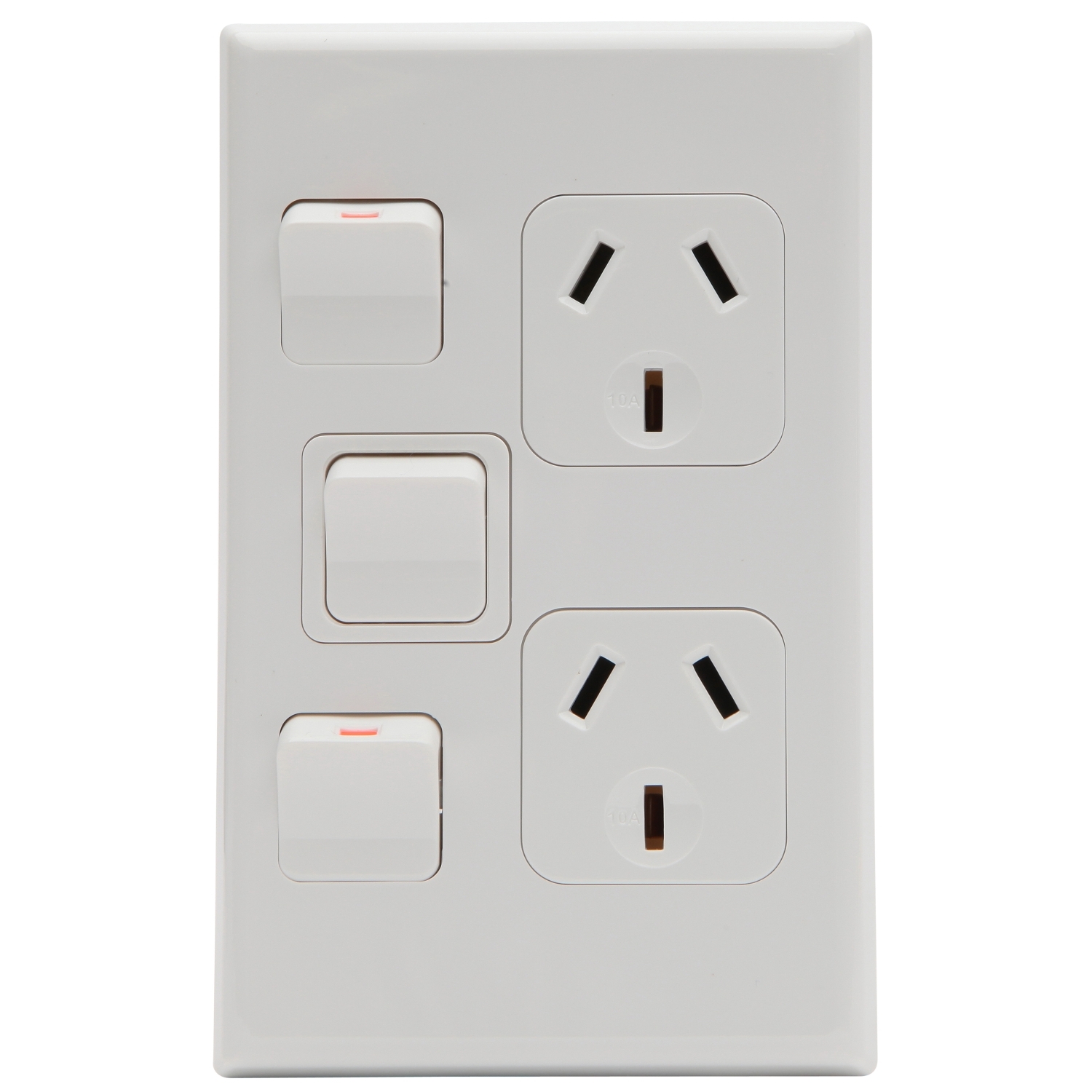 Socket outlet assembly for vertical installations. Twin switched socket with extra switch. 600 Series cover and socket grid are included. PDL 600. Colour: White Rated current: 10A (socket), 16AX (extra switch). Operating voltage 250V a.c. 50Hz. Note: Requires installation by an appropriately licenced electrician.