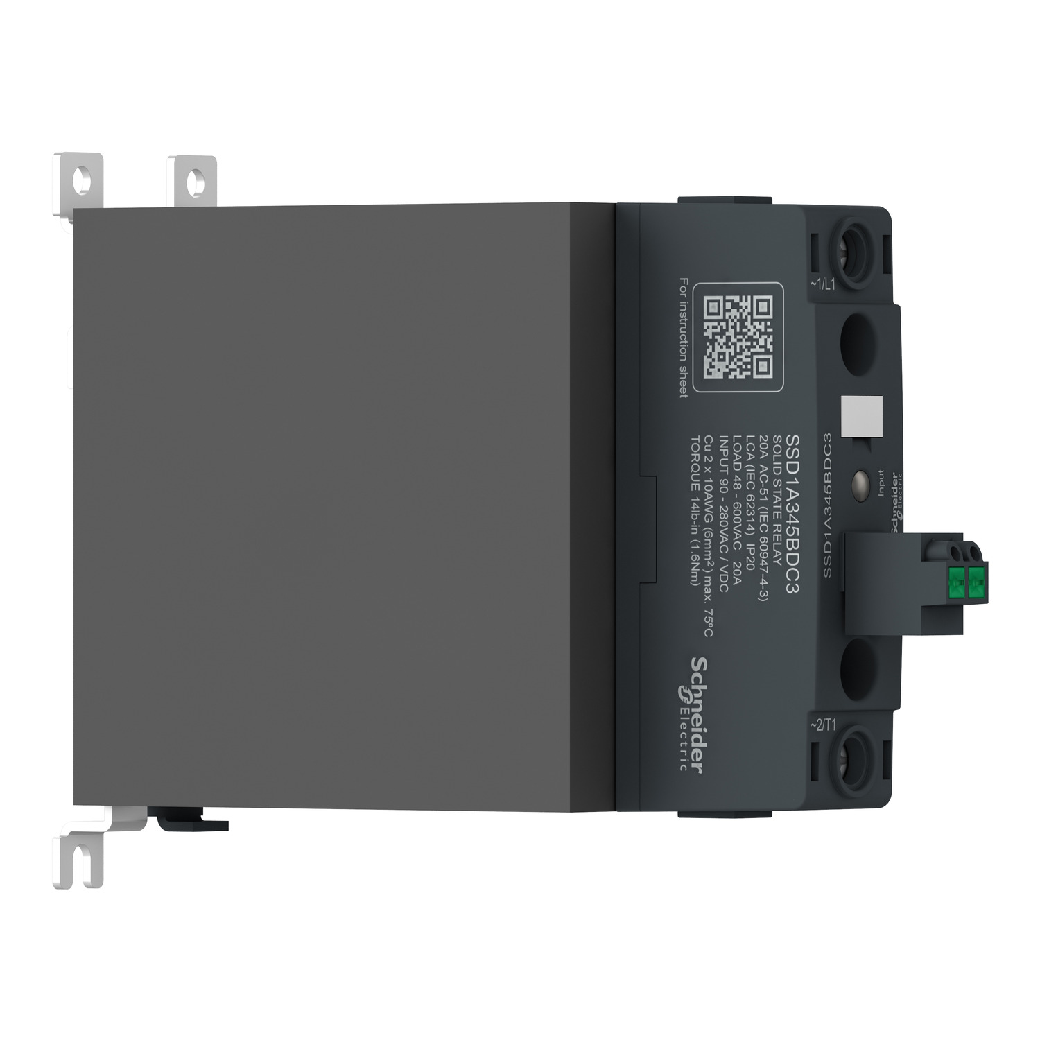 This solid state DIN rail mounted relay belongs to the Schneider Electric Harmony solid state relays range. This electrical relay mounts on 35mm DIN rail and comes with a secure mounting latch. This is a 45A power rated relay with pluggable spring input contactor type configuration and zero voltage switching. This single-phase relay has a IP20 built-in heat sink and a built-in transient overvoltage protection. It is controlled with a 4Vdc to 32Vdc input, has a rated load voltage of 48Vac to 600Vac. It also has a LED input voltage status indicator and clip-in legend for easy identification. It weighs 0.507Kg and its dimensions are, 45mm wide, 154.4mm deep, 111.5mm high. It is the ideal solution for packaging, plastic molding, textile, and heating furnace applications. This relay conforms to international standards like EN/IEC 60068, IEC 61373, UL 508, CSA C22.2 No 14-13 and certifications like UL and CSA. Besides the existing standard screw connection for input and output, SSD provides more wiring options like the spring or screw pluggable input connectors, and telescopic or clamp cage output terminals.