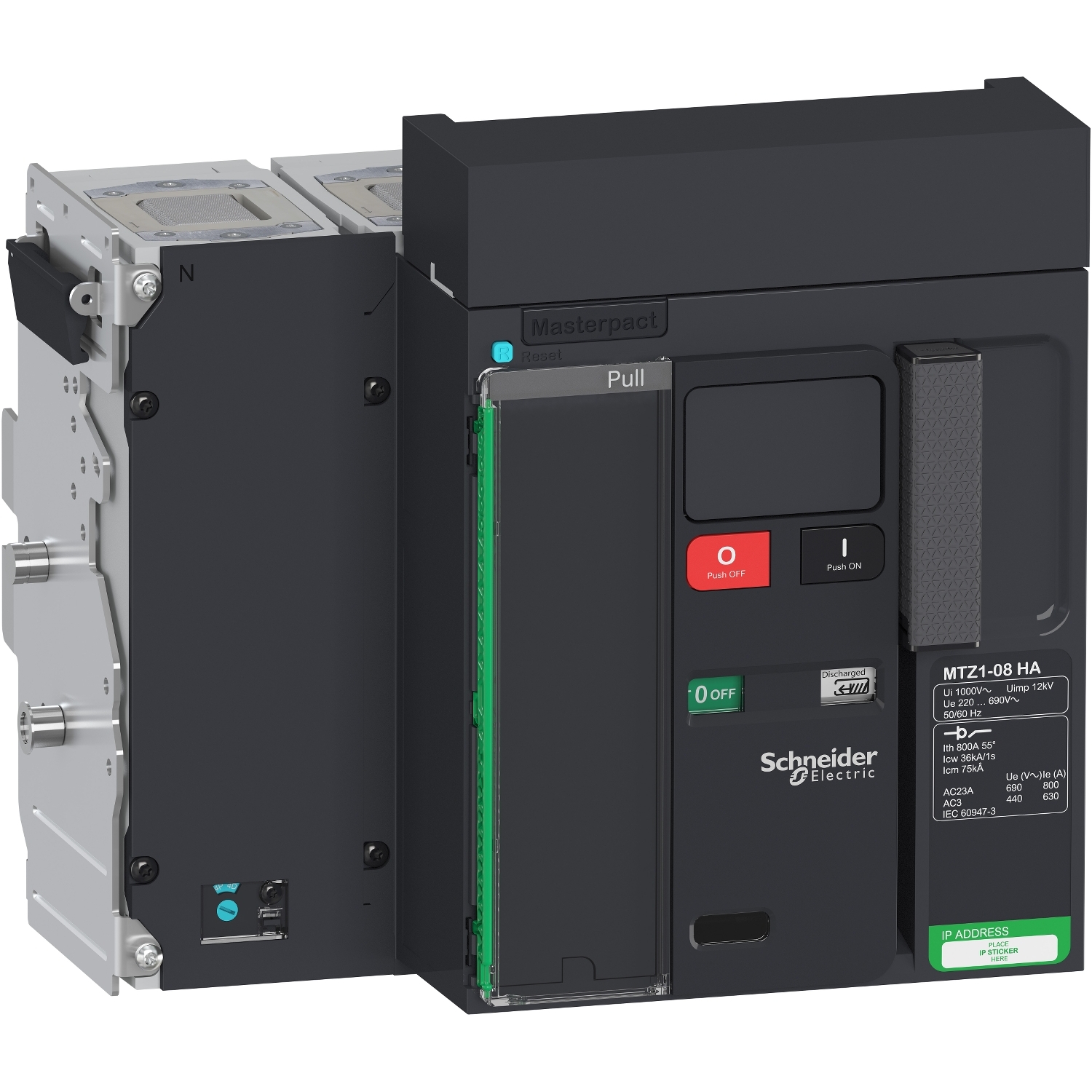 It is a 4 poles switch disconnector MasterPact MTZ1 08HA in drawout version. MasterPact MTZ is the last generation of high current air circuit breakers and switch disconnectors up to 6300A embedding advanced digital technologies. MasterPact MTZ is designed to protect electrical systems from damage caused by overloads, short circuits and equipment ground faults. The rated current is 800A. The maximum operational voltage is 690VAC 50/60Hz. The rated making capacity (Icm) is 75kA peak at 690VAc within AC-23A category. The rated short-time withstand current (Icw) is 36kA rms/1s within AC-23A category. The basic frame must be associated with the corresponding chassis which has also to be ordered separately. It can be equipped with a variety of optional functions and accessories. The dimensions are 358mm (W) x 322mm (H) x 291mm (D). MasterPact MTZ switch disconnector is compliant with international standards IEC/EN 60947-1 and IEC/EN 60947-3. MasterPact MTZ can be used in EcoStruxure architecture system. MasterPact MTZ is part of the global Schneider environmental data program.