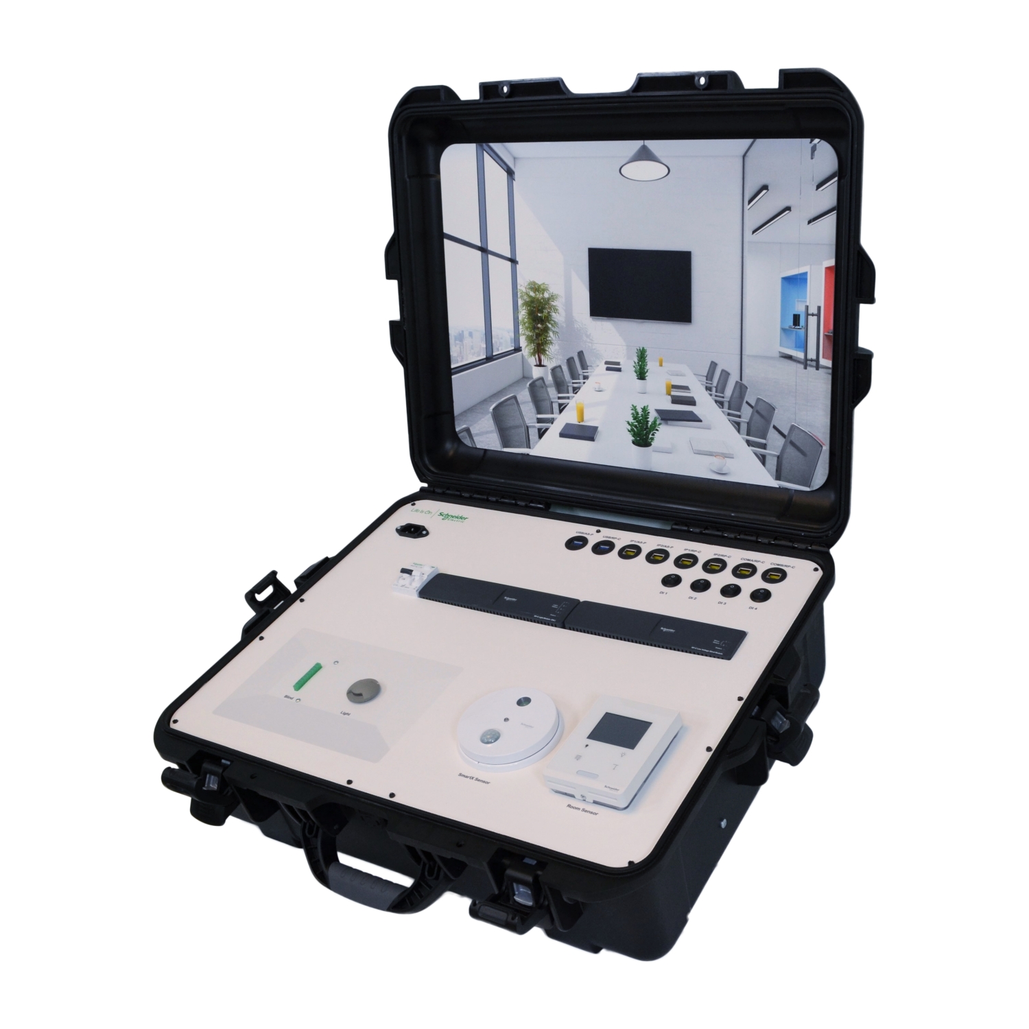 The SpaceLogic RP-C-CRS-DEMO is a demonstration kit for the Connected Room Solutions for Buildings. It is intended for demos in trade shows, trainings, and in meetings with partners, system integrators, consultants, and end customers. It demonstrates Connected Room Solution funtions such as light and blind control, multi-sensor operation, and control using SpaceLogic Sensors. The demo kit is designed for 230 VAC (50/60 Hz) operation. It includes one AS-P, one PS-24V ,one RP-C, one DALI light module, one blind module, one multi-sensor, one SpaceLogic sensor base and cover.