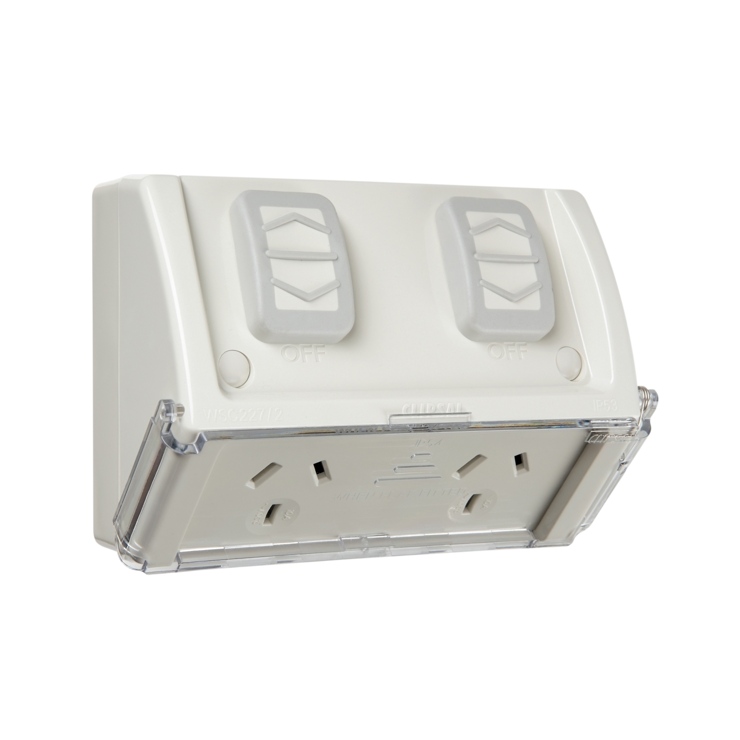 Twin Switch Socket Outlet, Weathershield, 250V, 10A, Weather Proof, Flap, Flush Mount, Double
