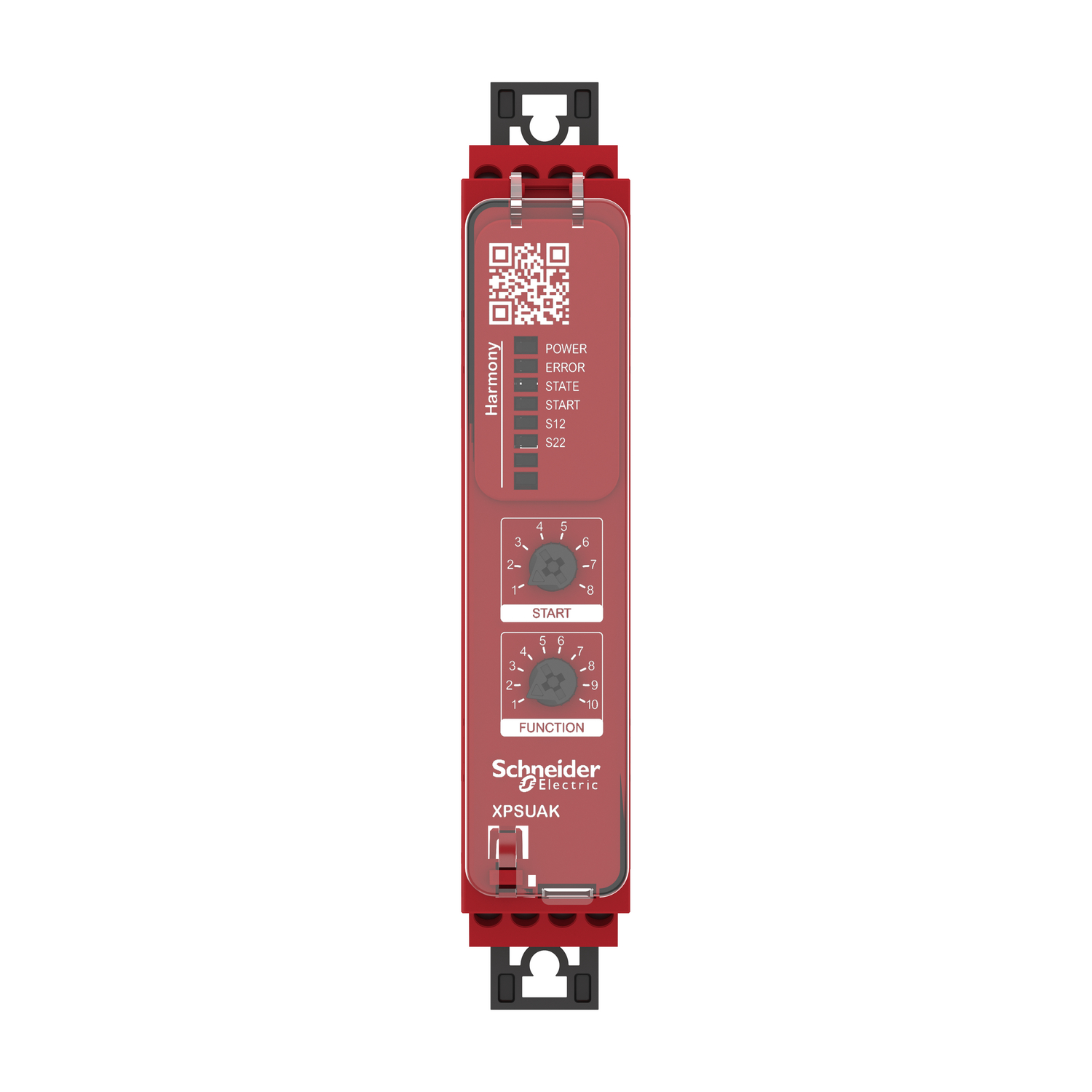 This safety relay is designed for monitoring Emergency stop, Guard switch, Magnetic switch, Proximity safety switch, PNP, NPN sensors, RFID safety switch, Safety light curtain or Sensing mat/edges. The safety relay is powered with 24V AC/DC, and equipped with a screw removable terminal block. This universal safety module embeds pre-defined safety functions, or selectable safety functions via rotary selectors. This safety relay embeds 2 safety inputs, 3 ON/OFF configurable pulsed outputs, 2 NO + 1 NC safety outputs, and 1 solid state diagnostic output with complete status information. The maximum safety level achieved by this safety relay is PLe/Category 4 conforming to ISO 13849-1, SILC L 3 conforming to IEC 62061, and SIL 3 conforming to IEC 61508. This safety relay weighs 0,200kg. Its dimensions are 22,5mm (Width) x 120mm (Depth) x 100mm (Height). This safety relay weighs 0,200kg. Its dimensions are 22,5mm (Width) x 120mm (Depth) x 100mm (Height). This safety relays is suitable for applications such as Food and Beverage, Hoisting, Material Handling, Material Working, Packaging. This safe relay conforms to IEC60947-5-1, IEC61508-1/2/3, ISO13849-1, IEC62061 functional safety standards, is certified by cULus, TÜV, EAC, CCC and KC marking. Harmony safety relays are compatible with Modicon logic controllers. This relay is mounted on a 35mm symmetrical DIN rail. Harmony XPS Basic and Universal safety relays are the first choice for managing single safety functions easily, typically in machines of simple to medium complexity. Harmony XPS Universal is the first choice for a broad range of simple to mid-complex machines.