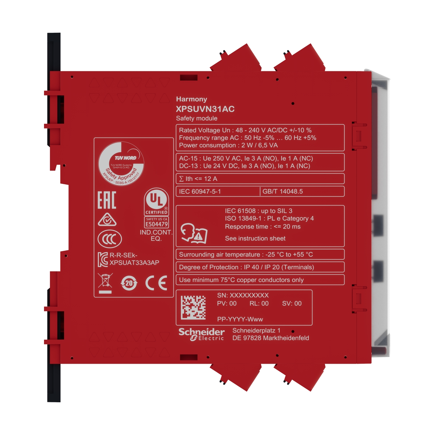 | Safety reliability data | type = B conforming to IEC 61508-1, SFF > 99% conforming to IEC 61508-1, PFHd = 2.44E-9 1/h conforming to IEC 61508-1, HFT = 1 conforming to IEC 61508-1, SFF > 99% conforming to IEC 62061, PFHd = 2.44E-9 1/h conforming to IEC 62061, HFT = 1 conforming to IEC 62061, PFHd = 2.44E-9 1/h conforming to ISO 13849-1, Dcavg = 98.9 % conforming to ISO 13849-1, MTTFd > 30 years conforming to ISO 13849-1 |